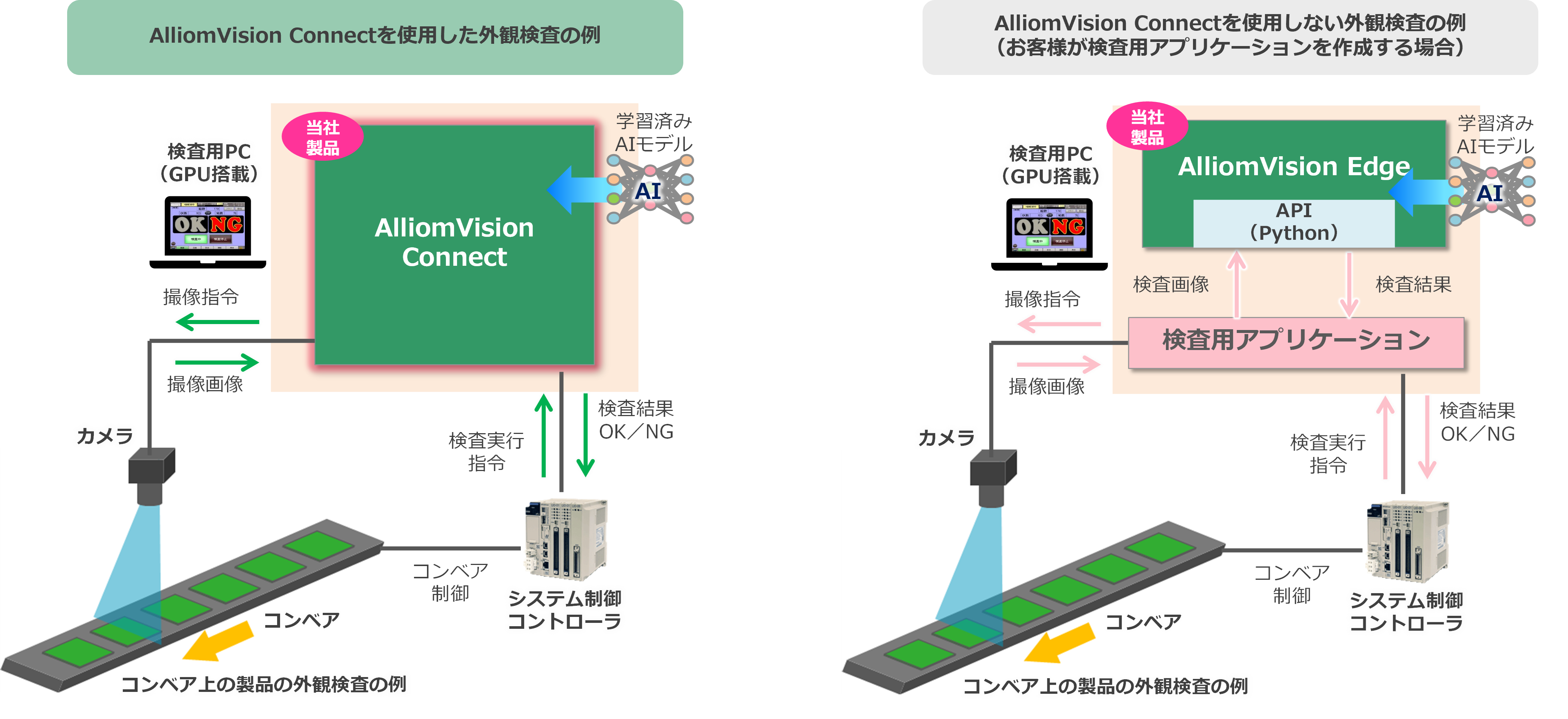 外観検査システムに必要な”カメラからの画像取得”、”AIモデルを使った検査”、”検査結果の表示、保存”、および”検査用PC↔システム制御コントローラ※2間通信”などを実行する専用ソフトウェア”AlliomVision Connect”を準備しております。