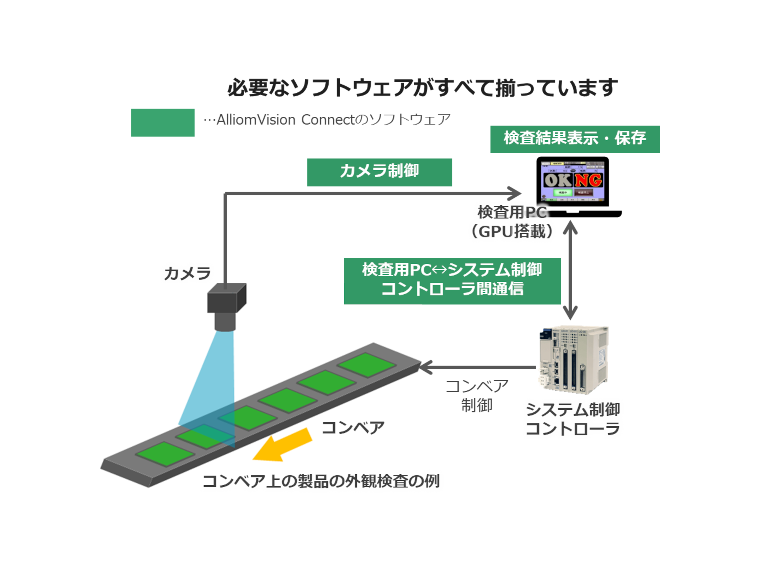 外観検査システムに必要な”カメラからの画像取得”、”AIモデルを使った検査”、および”検査結果の表示、保存”、”検査用PC↔システム制御コントローラ※間通信”などを実行する専用ソフトウェア”AlliomVision Connect”を準備しております。